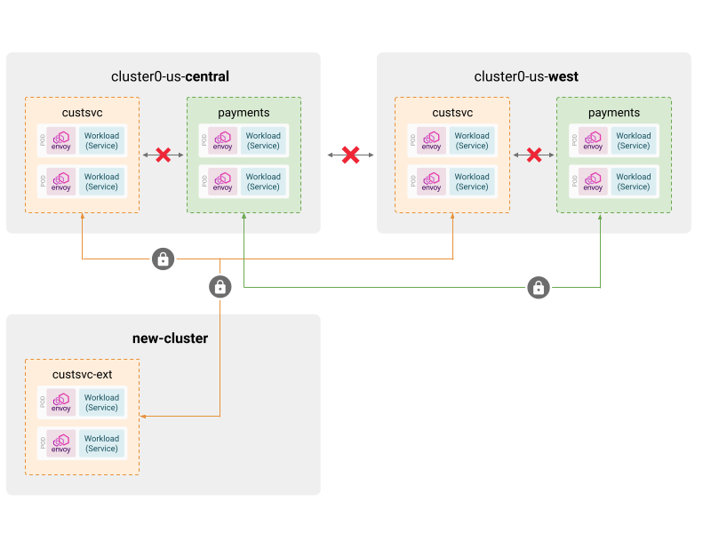 Similarly, the workspace for the Payments application will configure policy and configuration for the “payments” namespace in the two clusters.