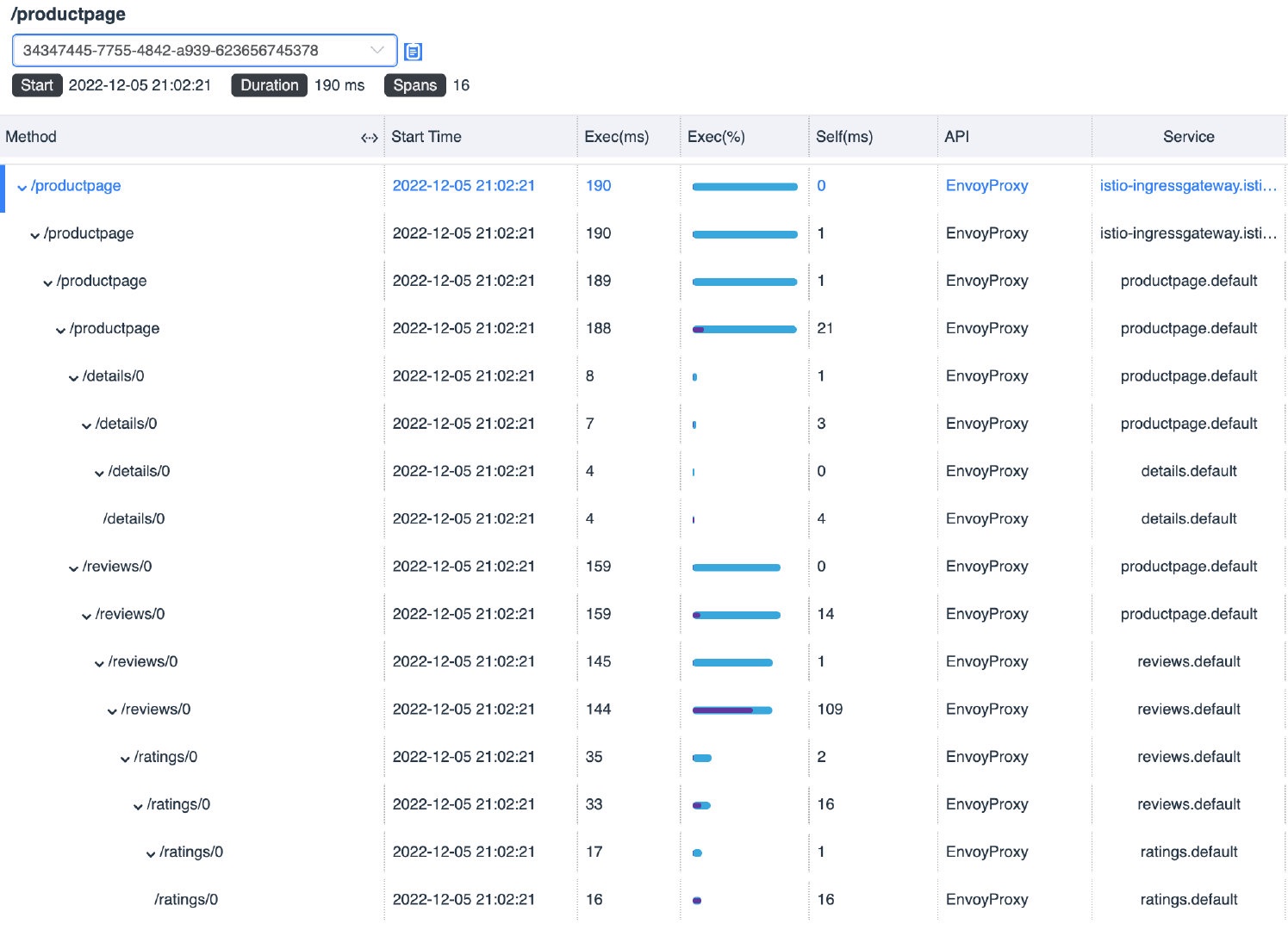 | 2 | /productpage | 190 | 1 | istio-ingressgateway | Ingress -> Productpage network transmission |