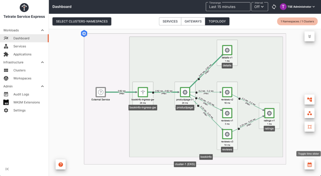 A major advantage of service mesh is to take policy code such as mTLS out of the app, but that’s not enough. Many teams implementing service mesh struggle to simply achieve requiring mTLS by default, especially when they scale beyond a single EKS cluster. TSE makes it easy to define global policies for all applications in the TSE platform, such as “mTLS required” in one step. Check the TSE mTLS guide for more details.