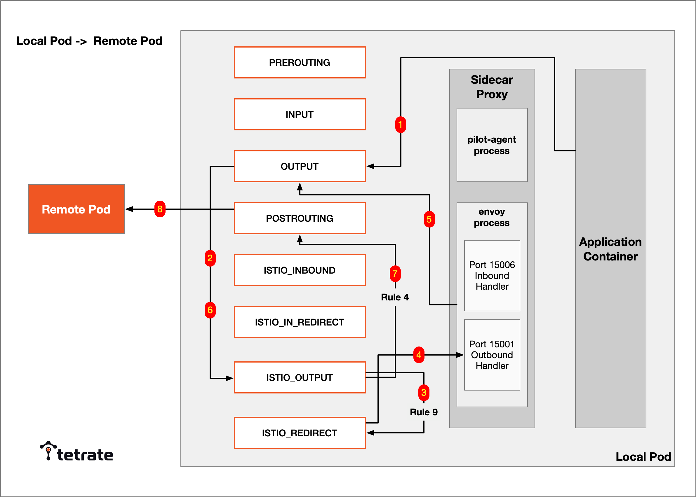 Remote Pod -> RREROUTING -> ISTIO_INBOUND -> ISTIO_IN_REDIRECT -> Envoy 15006 (Inbound) -> OUTPUT -> ISTIO_OUTPUT RULE 1 -> POSTROUTING -> Local Pod