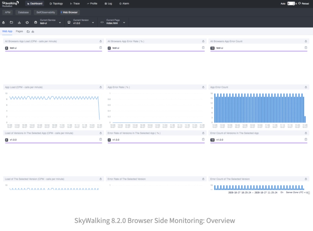 In 8.2.0, SkyWalking extends its monitoring boundary to the browser side, e.g., Chrome, or the network between Chrome and the backend service, or the codes running in the browser. With this, not only can we monitor the backend services and requests sent by the browser as usual, but also the front end rendering speed, error logs, etc., which are the most efficient metrics for capturing the experiences of our end users. (This does not currently extend to IoT devices, but this feature moves SkyWalking a step in that direction).